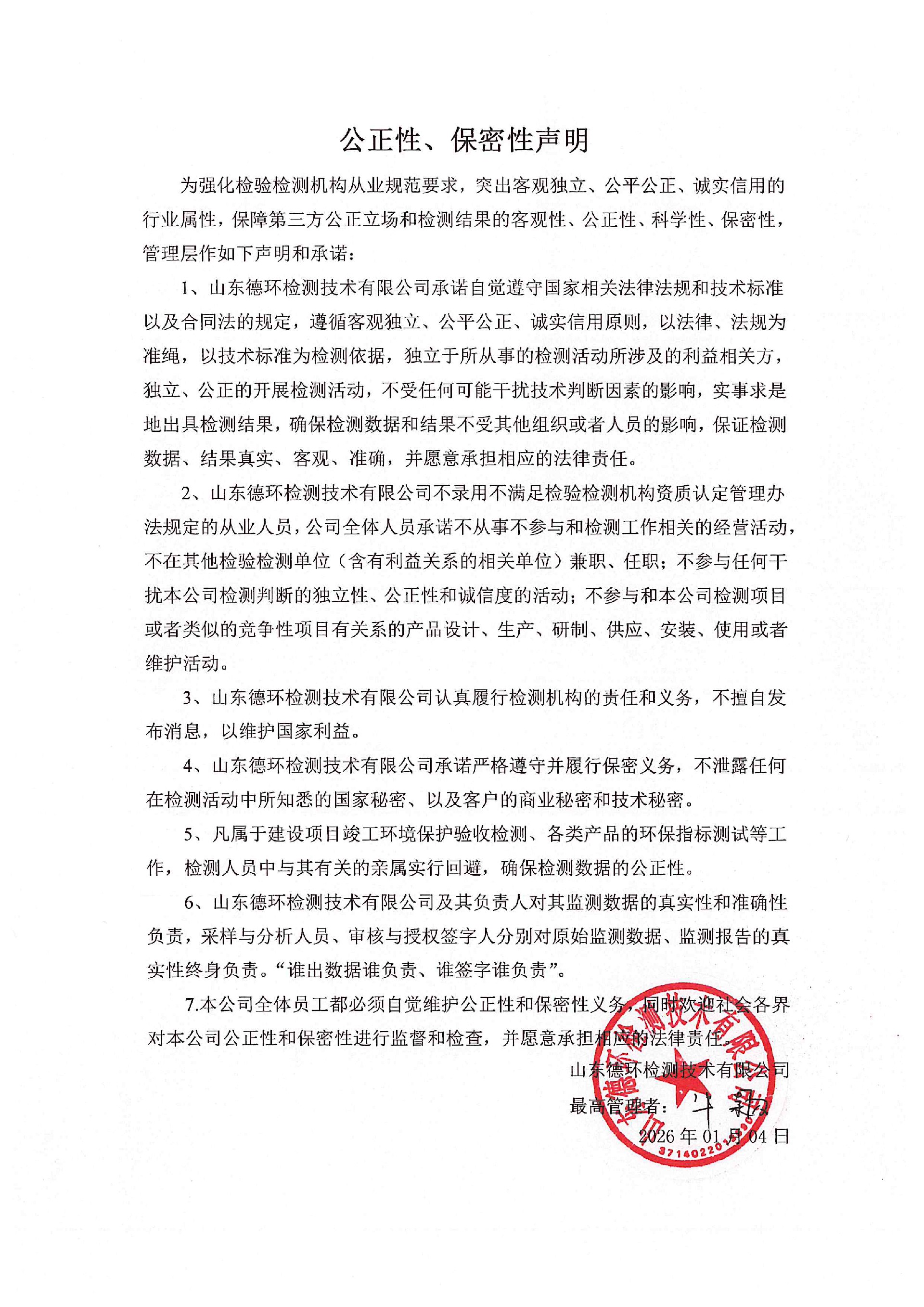 為強化檢驗檢測機構(gòu)從業(yè)規(guī)范要求,突出客觀獨立、公平公正、誠實信用的行業(yè)屬性,保障第三方公正立場和檢測結(jié)果的客觀性、公正性、科學性、保密性,管理層作如下聲明和承諾: 1、山東德環(huán)檢測技術(shù)有限公司承諾自覺遵守國家相關(guān)法律法規(guī)和技術(shù)標準以及合同法的規(guī)定,遵循客觀獨立、公平公正、誠實信用原則,以法律、法規(guī)為準繩,以技術(shù)標準為檢測依據(jù),獨立于所從事的檢測活動所涉及的利益相關(guān)方,獨立、公正的開展檢測活動,不受任何可能干擾技術(shù)判斷因素的影響,實事求是地出具檢測結(jié)果,確保檢測數(shù)據(jù)和結(jié)果不受其他組織或者人員的影響,保證檢測數(shù)據(jù)、結(jié)果真實、客觀、準確,并愿意承擔相應的法律責任。 2、山東德環(huán)檢測技術(shù)有限公司不錄用不滿足檢驗檢測機構(gòu)資質(zhì)認定管理辦法規(guī)定的從業(yè)人員,公司全體人員承諾不從事不參與和檢測工作相關(guān)的經(jīng)營活動,不在其他檢驗檢測單位(含有利益關(guān)系的相關(guān)單位)兼職、任職;不參與任何干擾本公司檢測判斷的獨立性、公正性和誠信度的活動;不參與和本公司檢測項目或者類似的競爭性項目有關(guān)系的產(chǎn)品設(shè)計、生產(chǎn)、研制、供應、安裝、使用或者維護活動。 3、山東德環(huán)檢測技術(shù)有限公司認真履行檢測機構(gòu)的責任和義務,不擅自發(fā)布消息,以維護國家利益。 4、山東德環(huán)檢測技術(shù)有限公司承諾嚴格遵守并履行保密義務,不泄露任何在檢測活動中所知悉的國家秘密、以及客戶的商業(yè)秘密和技術(shù)秘密。 5、凡屬于建設(shè)項目竣工環(huán)境保護驗收檢測、各類產(chǎn)品的環(huán)保指標測試等工作,檢測人員中與其有關(guān)的親屬實行回避,確保檢測數(shù)據(jù)的公正性。 6、山東德環(huán)檢測技術(shù)有限公司及其負責人對其監(jiān)測數(shù)據(jù)的真實性和準確性負責,采樣與分析人員、審核與授權(quán)簽字人分別對原始監(jiān)測數(shù)據(jù)、監(jiān)測報告的真實性終身負責。“誰出數(shù)據(jù)誰負責、誰簽字誰負責”。 7.本公司全體員工都必須自覺維護公正性和保密性義務,同時歡迎社會各界對本公司公正性和保密性進行監(jiān)督和檢查,并愿意承擔相應的法律責任。 山東德環(huán)檢測技術(shù)有限公司 2026年01月04日 微信圖片_20260104090332.jpg